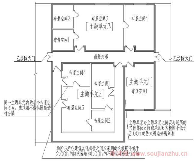 5.2.2 實(shí)景劇本娛樂(lè)經(jīng)營(yíng)場(chǎng)所包含各個(gè)主題單元、疏散區(qū)域以及配套的功能用房。每個(gè)主題單元應(yīng)按本導(dǎo)則3.3.2條第3款要求的防火分隔劃分為面積不大于400㎡獨(dú)立的防火單元。當(dāng)布置在地下一層(含半地下室)或地上四層及以上樓層時(shí),場(chǎng)所位于這些樓層的每層建筑面積不應(yīng)超過(guò)其所在建筑規(guī)范允許的一個(gè)防火分區(qū)的面積。同一主題單元內(nèi)有多個(gè)布景時(shí),應(yīng)采用不燃性隔斷進(jìn)行分隔。