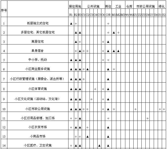 第九條 各類建設用地的劃分,應遵循土地使用相容性的原則。在有經(jīng)批準的詳細規(guī)劃的地段內(nèi)進行建設,應按經(jīng)批準的詳細規(guī)劃執(zhí)行;尚無經(jīng)批準的詳細規(guī)劃的,應根據(jù)城市總體規(guī)劃和本規(guī)定表1《各建設用地適建范圍表》的規(guī)劃執(zhí)行。