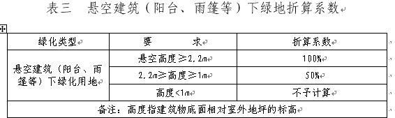 (二)懸空建筑(陽臺、雨篷等)下綠地,具體計算方法參照表三。