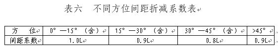 2.平行布置且方位為非正南北向時,住宅正面間距可按表六《不同方位間距折減系數(shù)》換算。