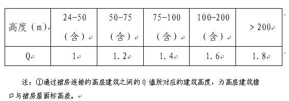 13.Q為高層建筑高度綜合影響系數(shù),是用來反映高層建筑由于高度不同而對周邊建筑的交通、視覺、環(huán)境等方面產(chǎn)生的綜合影響程度。Q值取值見下表: