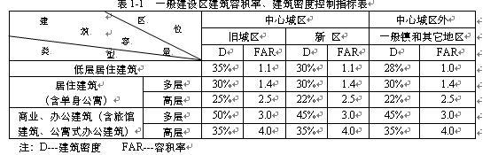 同一地塊兼容不同用地性質(zhì)或建筑層數(shù)混雜的建設(shè)項(xiàng)目,在符合相關(guān)規(guī)范的基礎(chǔ)上,由規(guī)劃行政主管部門(mén)根據(jù)實(shí)際情況參照表1-1確定建筑容量指標(biāo)。