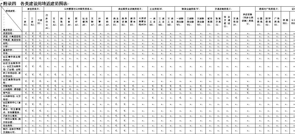 各類(lèi)建設(shè)工程的規(guī)劃設(shè)計(jì)、建設(shè)和管理應(yīng)根據(jù)《各類(lèi)建設(shè)用地適建范圍表》的規(guī)定執(zhí)行?!陡黝?lèi)建設(shè)用地適建范圍表》中未列入的建設(shè)項(xiàng)目,應(yīng)由城鄉(xiāng)規(guī)劃行政主管部門(mén)根據(jù)地塊對(duì)周邊環(huán)境的影響和外部基礎(chǔ)設(shè)施條件,具體核定適建范圍。