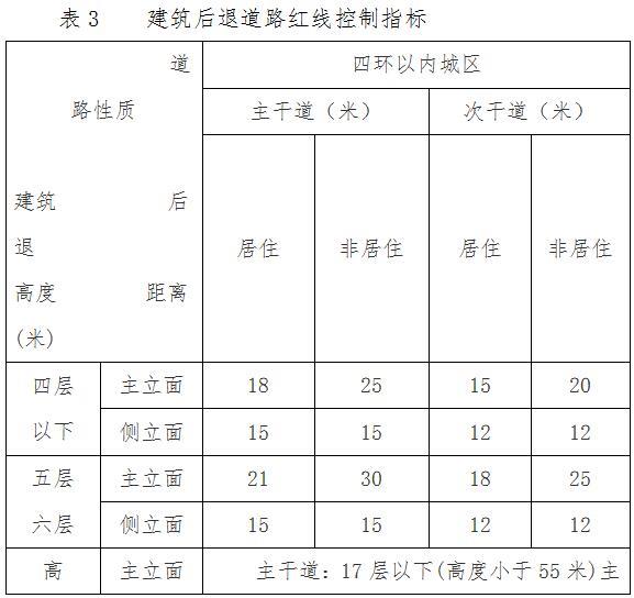 注:(1)表1規(guī)定的指標(biāo)中容積率(低層、工業(yè)、物流倉(cāng)儲(chǔ)建筑除外)、建筑密度為上限,適用于單一類型的建筑基地。對(duì)混合類型的建筑基地,其建筑容量控制指標(biāo)應(yīng)按整個(gè)地塊使用性質(zhì)綜合平衡。