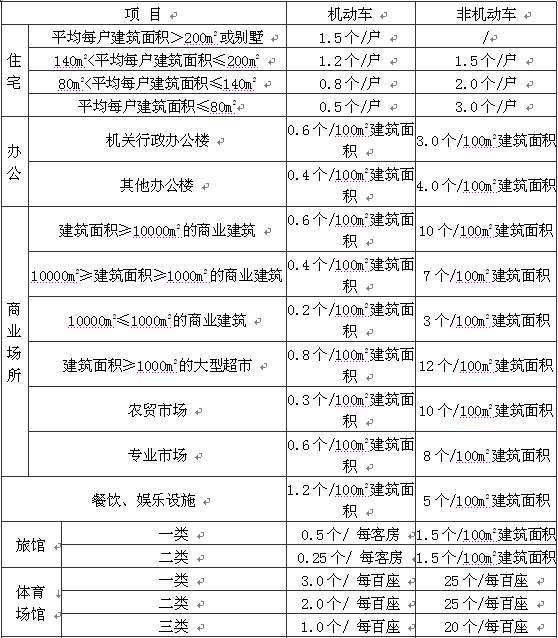 注:表內(nèi)機(jī)動車車位面積以小型汽車為計算當(dāng)量,各類機(jī)動車輛與小型汽車停車位的面積換算系數(shù)為:微型汽車:0.7,中型汽車:2.0,大型汽車:2.5,鉸接車:3.5。
