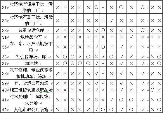 注:√允許設(shè)置;×不允許設(shè)置;○允許或不允許設(shè)置,由城市規(guī)劃行政主管部門根據(jù)具體條件和規(guī)定要求確定。