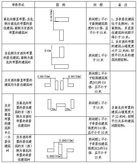 第十條 低層、多層建筑與低層、多層居住建筑(不包括老年人居住建筑)垂直布置時的間距按照《低層、多層建筑與低層、多層居住建筑(不包括老年人居住建筑)垂直布置間距控制表》(見附表2)的標(biāo)準(zhǔn)控制。高層建筑與居住建筑垂直布置時的最小間距不得小于13米。