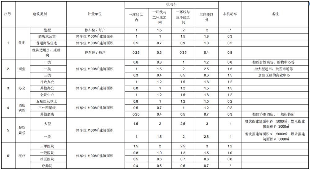 5. 遠(yuǎn)城區(qū)的城鎮(zhèn)區(qū)域建筑物配建停車(chē)場(chǎng)可參照上表二環(huán)線內(nèi)停車(chē)位指標(biāo)控制值,其它區(qū)域可參照二環(huán)線外停車(chē)位指標(biāo)控制值。