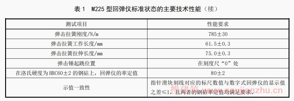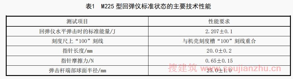 M225型回彈儀標準狀態(tài)的主要技術性能應滿足表1要求。