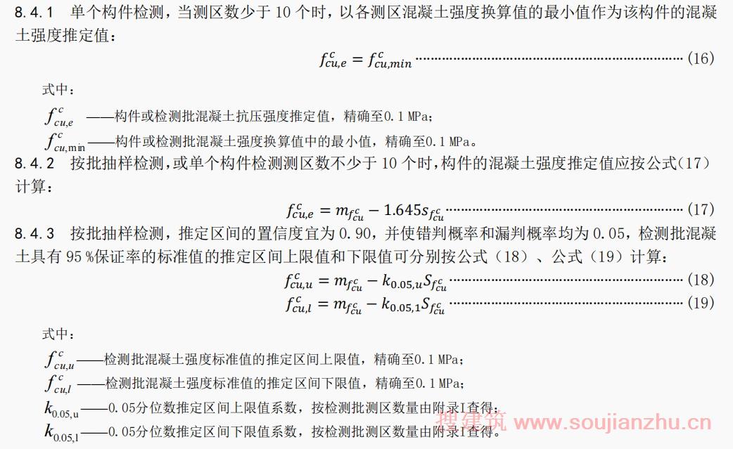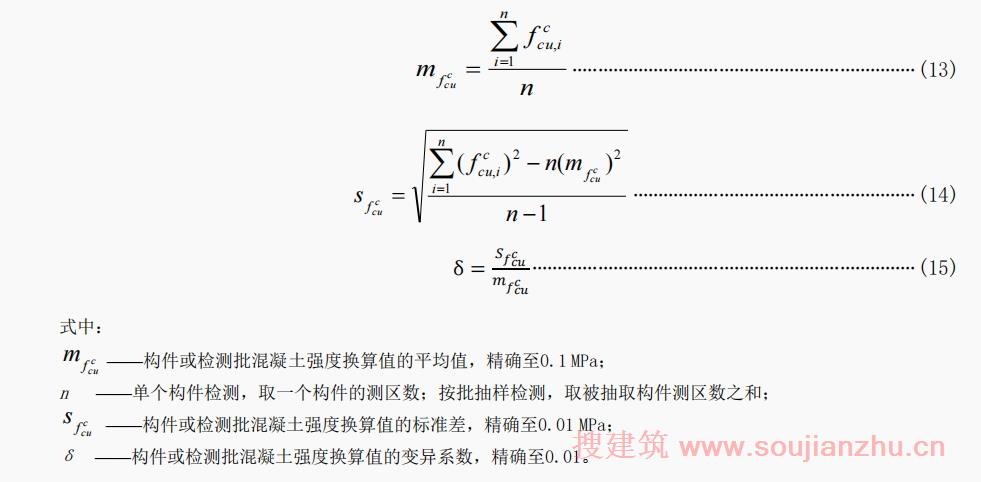 測區(qū)數(shù)不少于10個時,應分別按公式(13)、公式(14)、公式(15)計算構件或檢測批混凝土強度換算值的平均值、標準差和變異系數(shù):