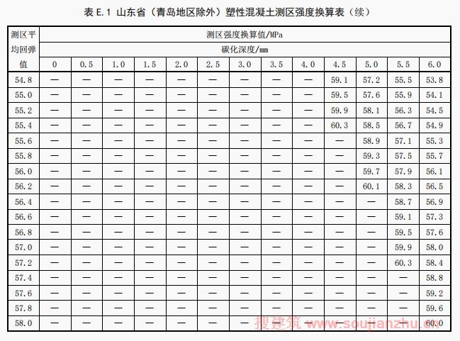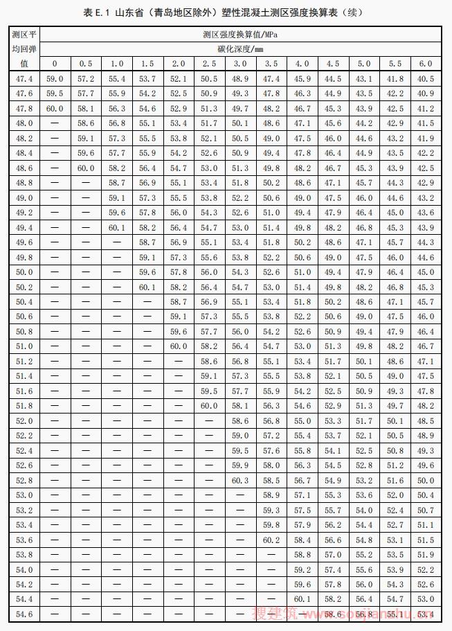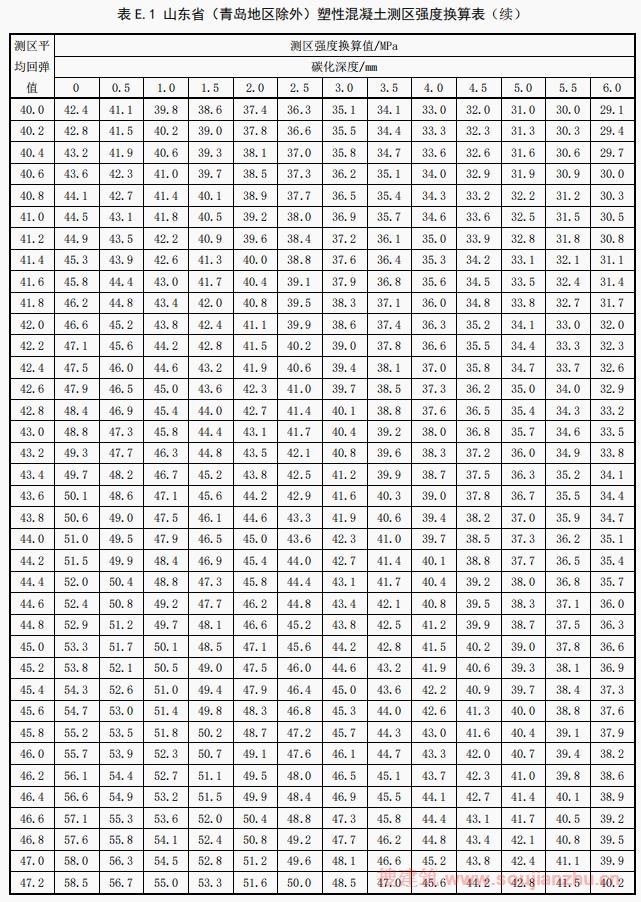 山東省(青島地區(qū)除外)塑性混凝土測區(qū)強度換算表見表E.1。