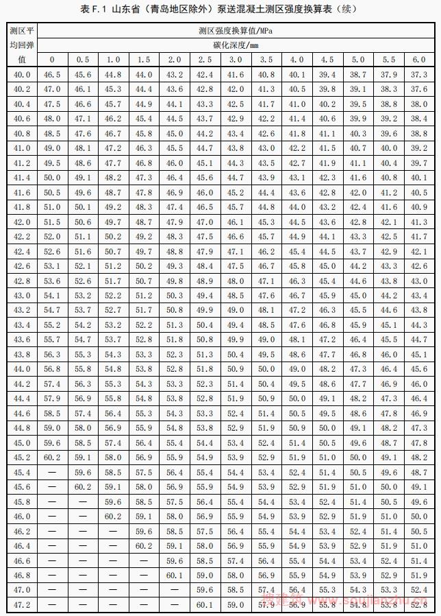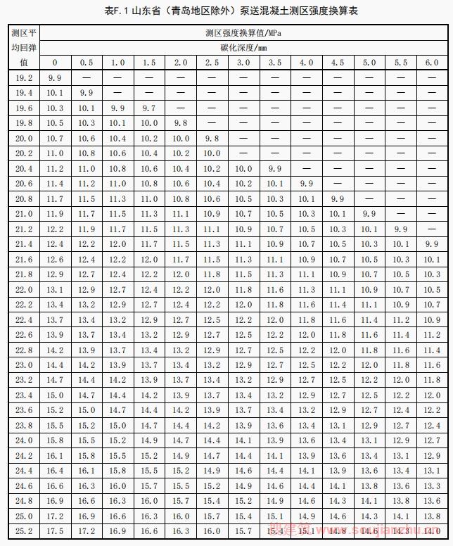 山東?。ㄇ鄭u地區(qū)除外)泵送混凝土測區(qū)強度換算表見表F.1。