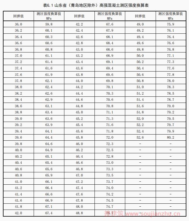 附錄 G (規(guī)范性) 山東?。ㄇ鄭u地區(qū)除外)高強混凝土測區(qū)強度換算表
