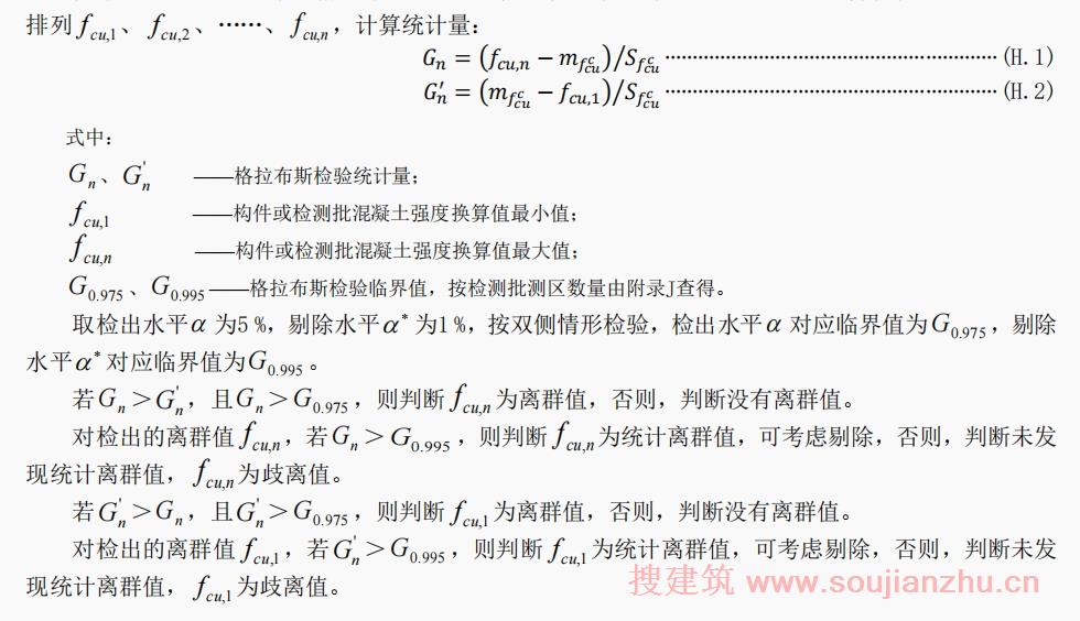 按批抽樣檢測或單個構件檢測測區(qū)數(shù)不少于10個時,應進行異常數(shù)據(jù)的判斷和處理,異常數(shù)據(jù)的判斷和處理應符合GB/T 4883的規(guī)定,按照附錄H執(zhí)行。