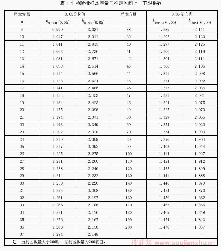 檢驗批樣本容量與推定區(qū)間上、下限系數(shù)見表I.1。